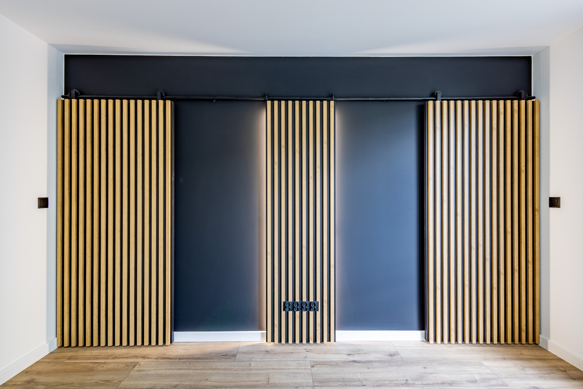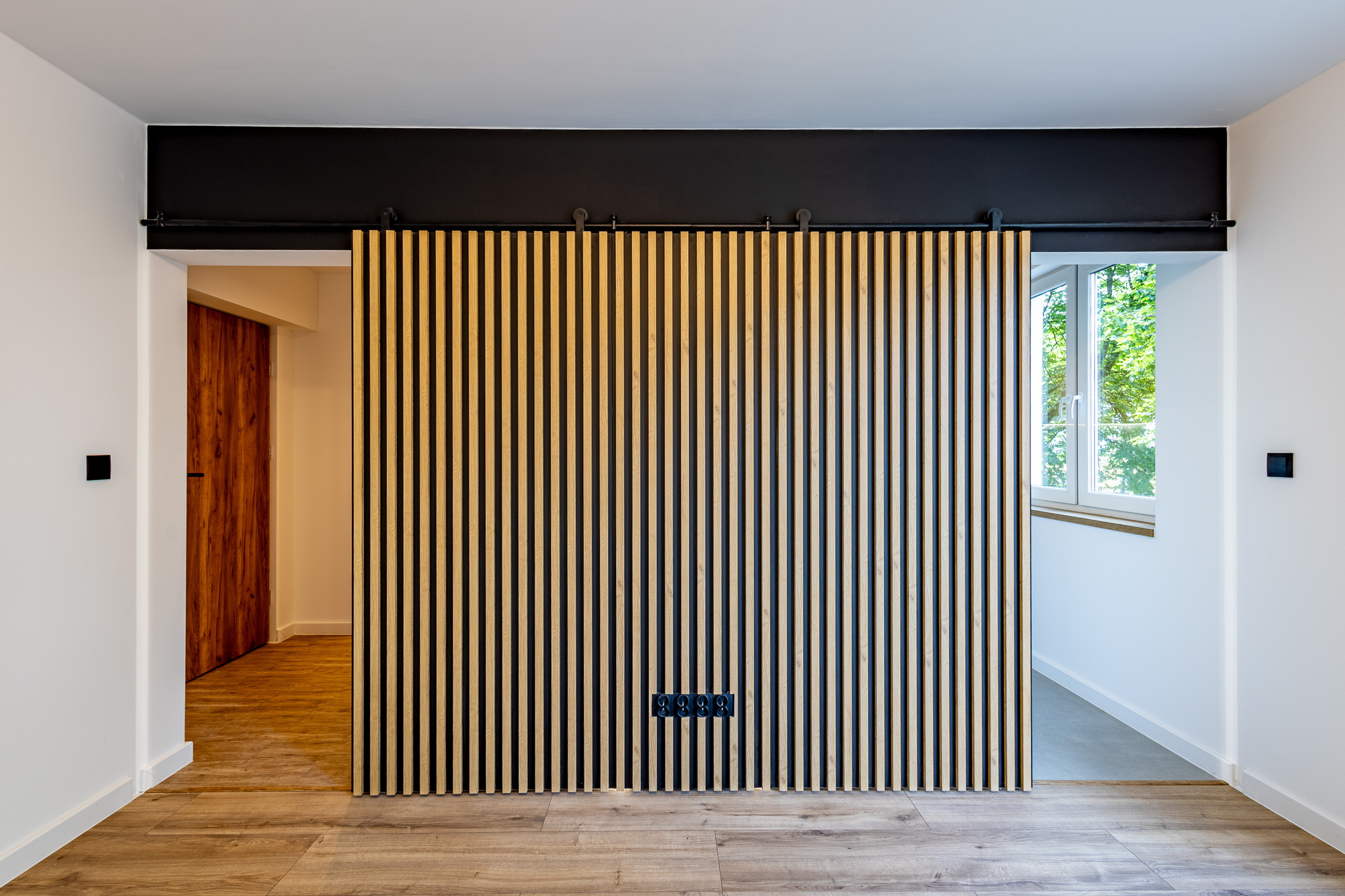 Dodałem drewniane lamele oddzielające strefy, a ciemne elementy, takie jak nowoczesny grzejnik i czarne akcenty nadały wnętrzu eleganckiej równowagi.