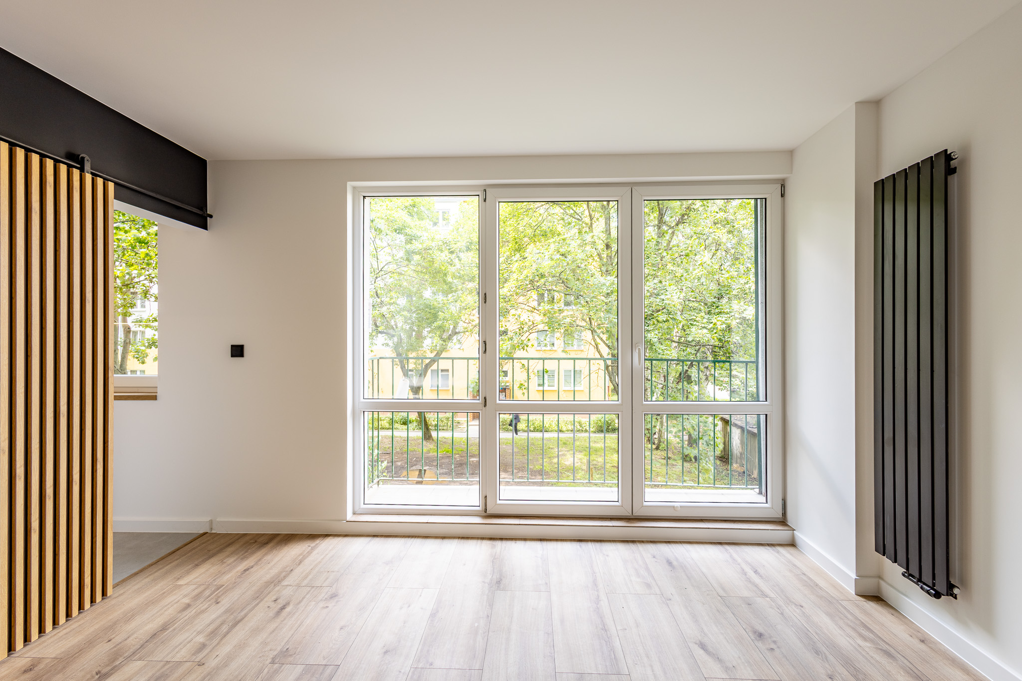 Duże, szerokie okno balkonowe wpuszcza mnóstwo naturalnego światła, a połączenie jasnych ścian i drewnianej podłogi sprawia, że wnętrze oddycha.